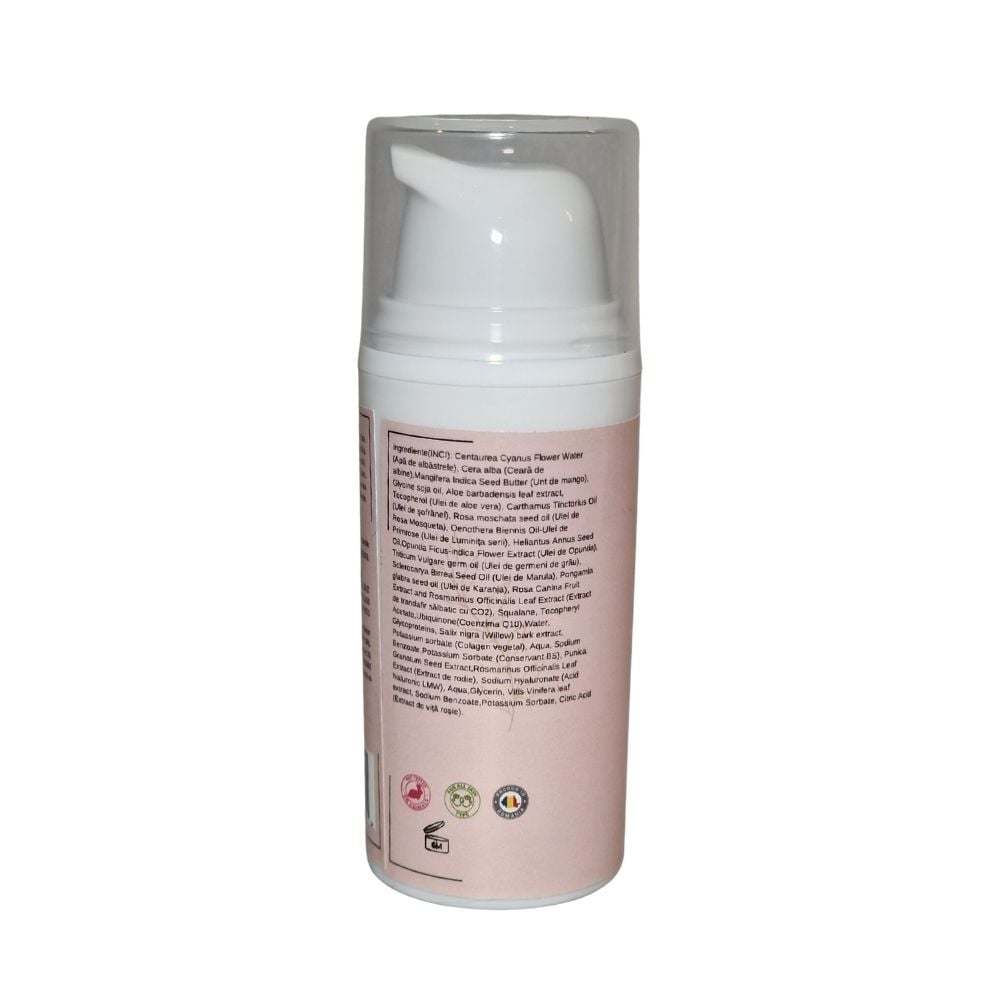 Centaurea Cyanus Flower Water (Apă de albăstrele), Cera alba (Ceară de albine),Mangifera Indica Seed Butter (Unt de mango), Glycine soja oil, Aloe barbadensis leaf extract, Tocopherol (Ulei de aloe vera), Carthamus Tinctorius Oil (Ulei de șofrănel), Rosa moschata seed oil (Ulei de Rosa Mosqueta), Oenothera Biennis Oil-Ulei de Primrose (Ulei de Luminița serii), Heliantus Annus Seed Oil,Opuntia Ficus-indica Flower Extract (Ulei de Opuntia), Triticum Vulgare germ oil (Ulei de germeni de grâu), Sclerocarya Birrea Seed Oil (Ulei de Marula), Pongamia glabra seed oil (Ulei de Karanja), Rosa Canina Fruit Extract and Rosmarinus Officinalis Leaf Extract (Extract de trandafir sălbatic cu CO2), Squalane, Tocopheryl Acetate,Ubiquinone(Coenzima Q10),Water, Glycoproteins, Salix nigra (Willow) bark extract, Potassium sorbate (Colagen vegetal), Aqua, Sodium Benzoate,Potassium Sorbate (Conservant BS), Punica Granatum Seed Extract,Rosmarinus Officinalis Leaf Extract (Extract de rodie), Sodium Hyaluronate (Acid hialuronic LMW), Aqua,Glycerin, Vitis Vinifera leaf extract, Sodium Benzoate,Potassium Sorbate, Citric Acid (Extract de viță roșie)